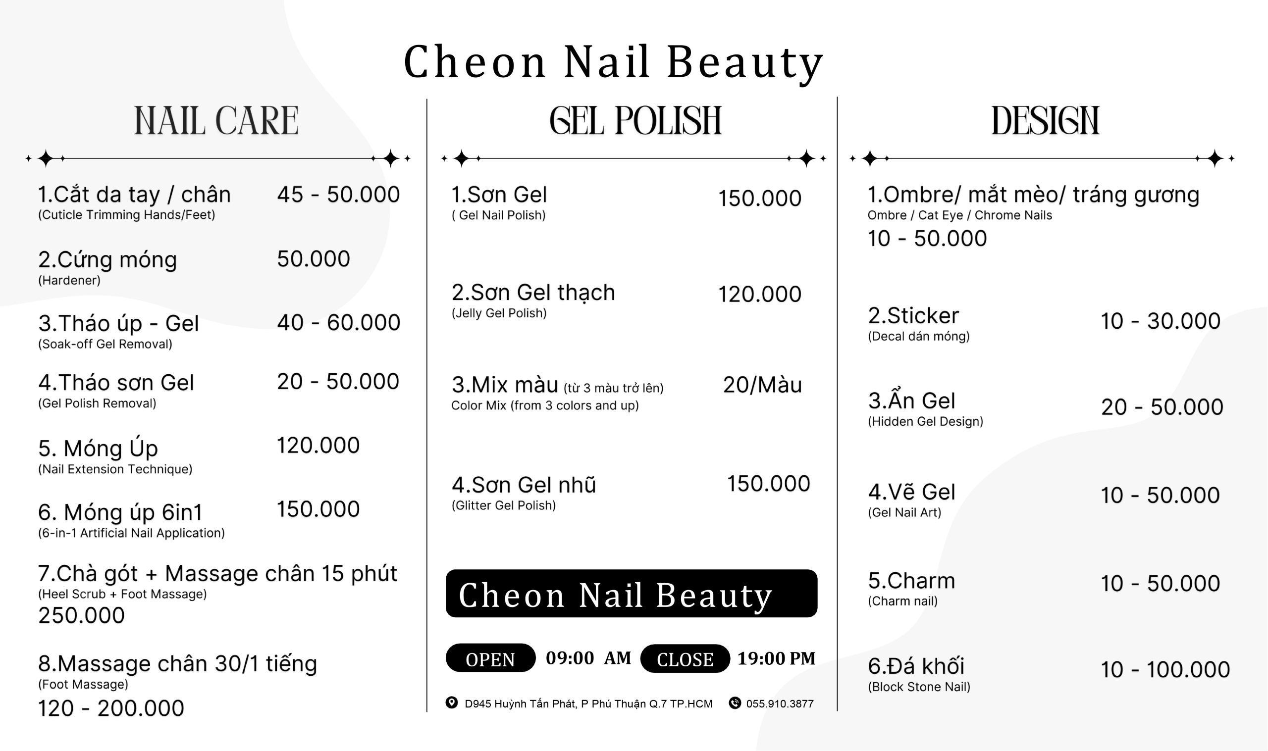 Dịch vụ nail không đơn thuần là làm đẹp cho móng tay và móng chân, mà còn là một phần của nghệ thuật chăm sóc ngoại hình và sức khỏe cá nhân. Tại Che-on Nail Beauty, chúng tôi mang đến trải nghiệm chăm sóc toàn diện, kết hợp kỹ thuật hiện đại với sự tinh tế trong từng chi tiết.